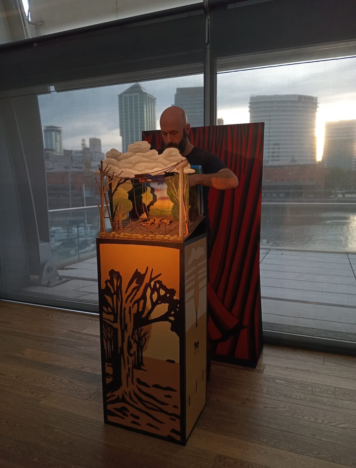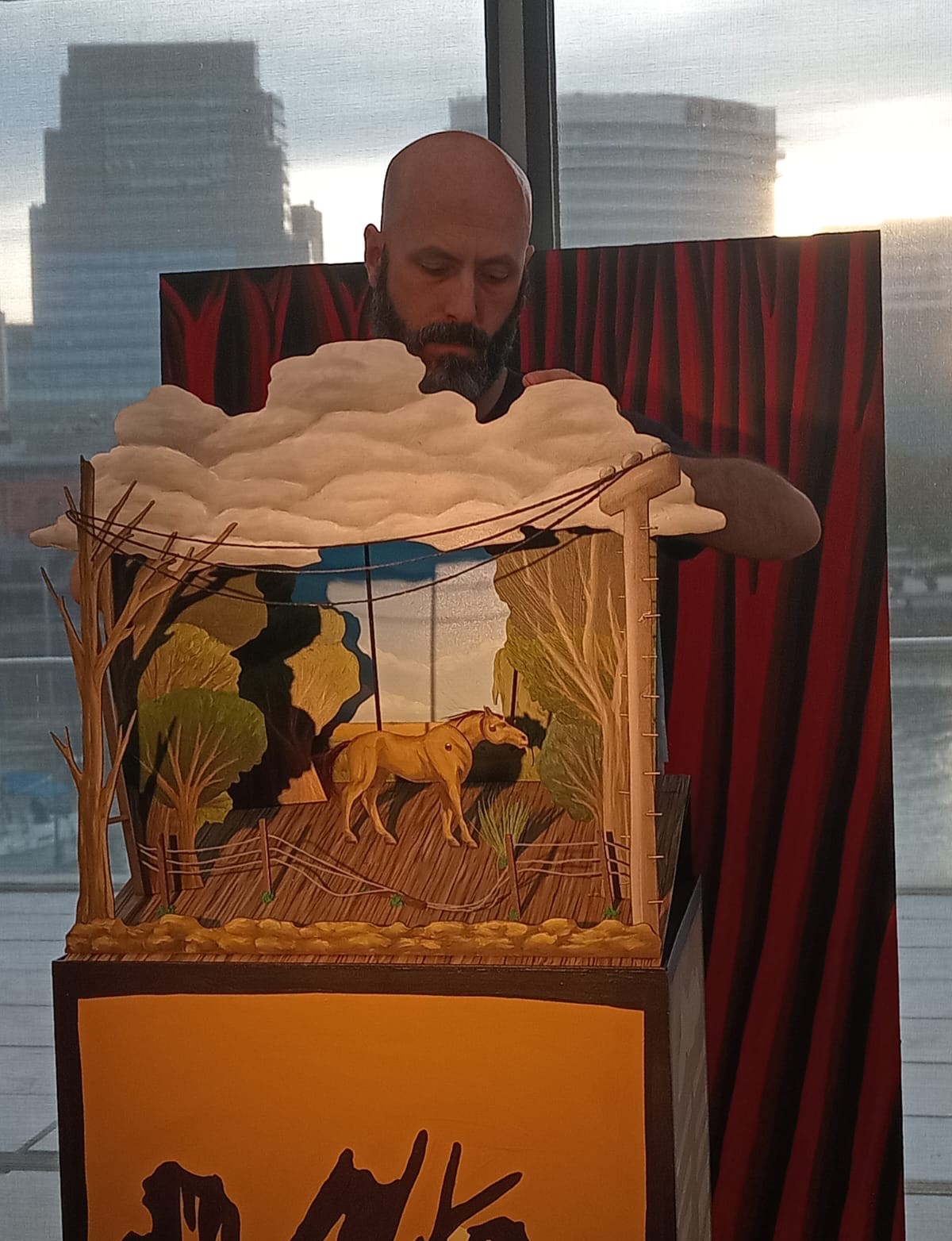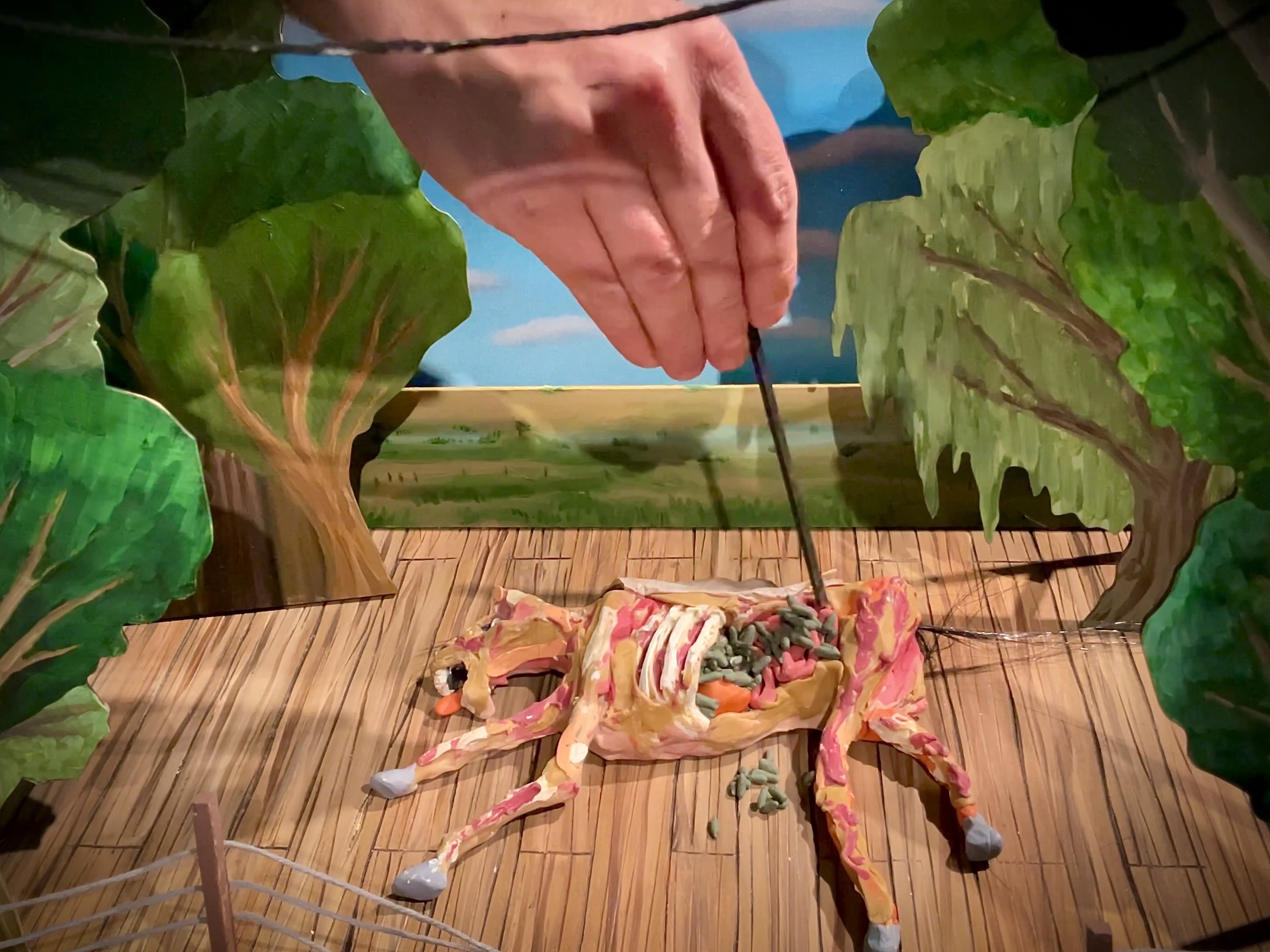 ES | Un teatrino con un paisaje pampeano es el escenario donde con diferentes títeres se narra el proceso de descomposición del cuerpo de un caballo. El trabajo toma como punto de partida el género del Kusôzu, un género de pintura japonesa donde, desde el siglo XIII, se ilustran las 9 etapas de descomposición de un cuerpo según la tradición budista.