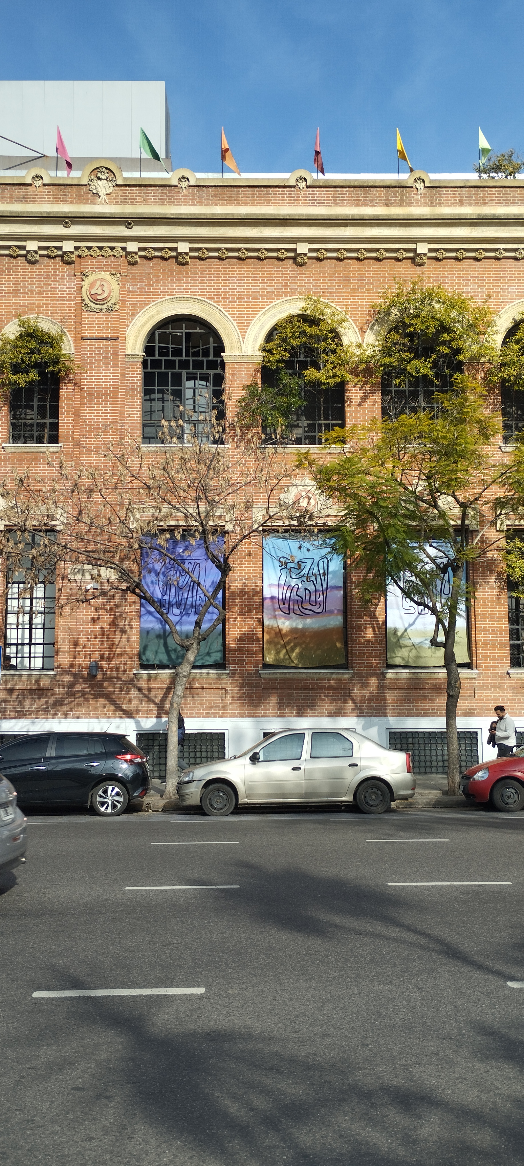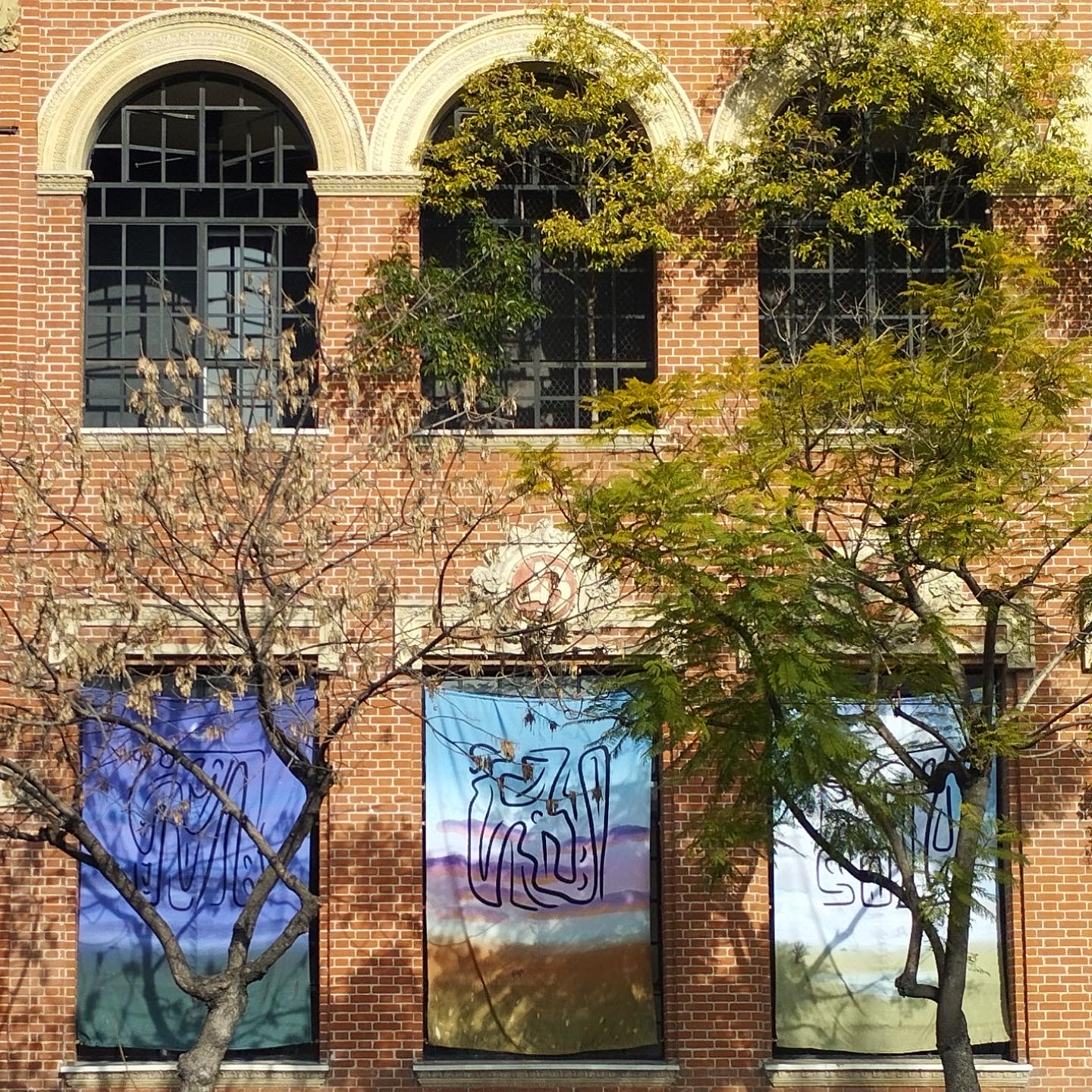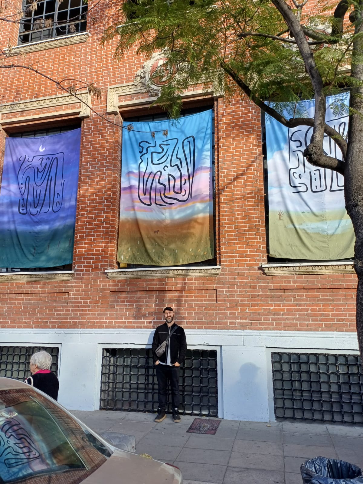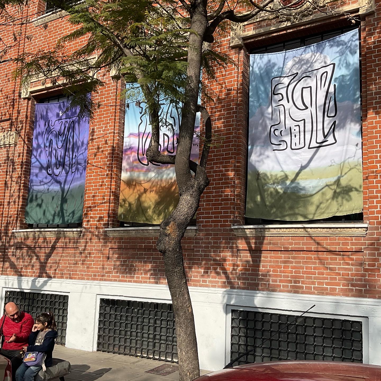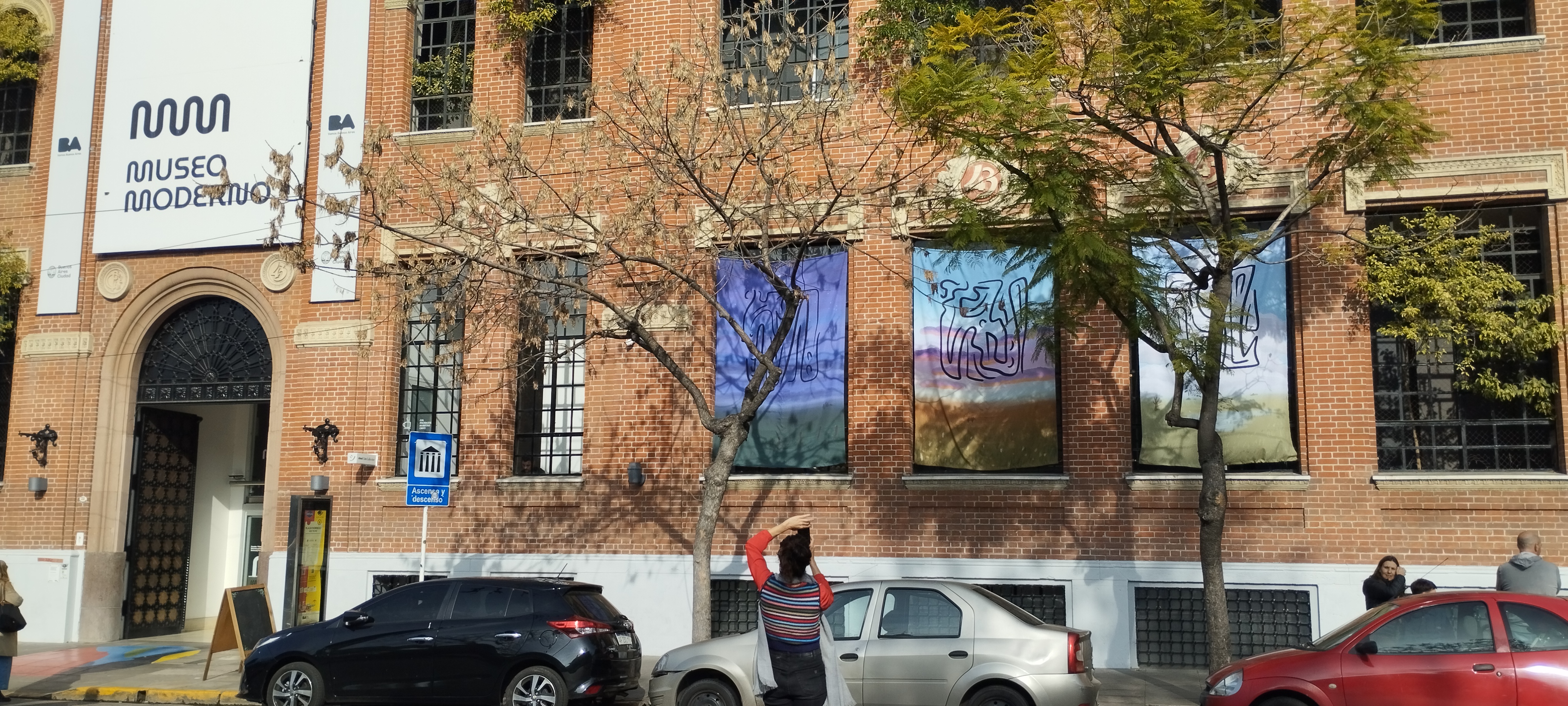 ES | Intervención de tres ventanas de la fachada del Museo de Arte Moderno de Buenos Aires con tres paisajes pampeanos: el día, el atardecer y la noche, cada uno con abstracciones en sus cielos.